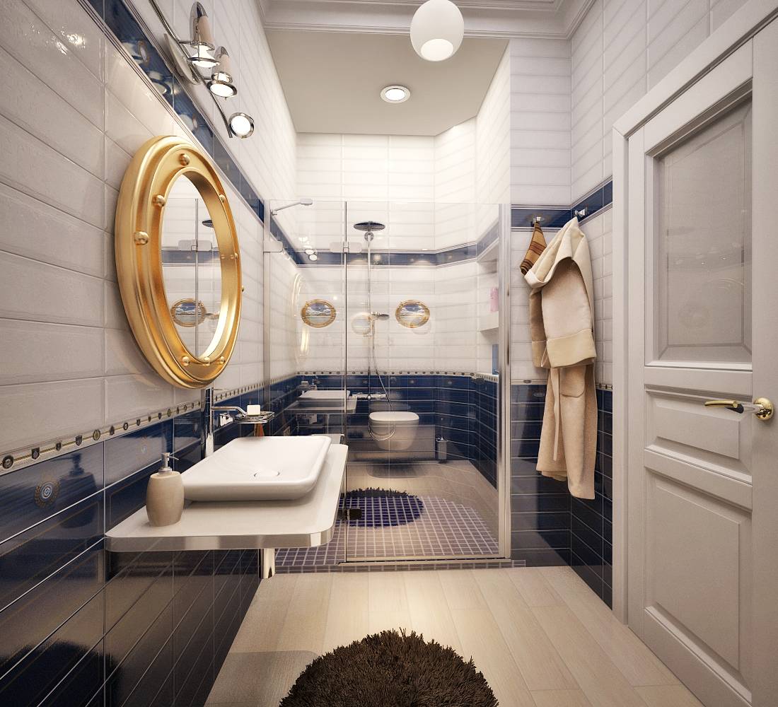 Присутствие в цветовой гамме синего и белого оттенков интуитивно напомнит о побережье, релаксации, приятных эмоциях. Хотя не все так однозначно. И любители креатива способны создать ощущение близости океана, воспроизвести в ванной комнате интерьер яхты. В этом случае для отделки пола используется массив тикового дерева, стены покрываются шпонированными панелями, зеркала оформляются в виде иллюминаторов.