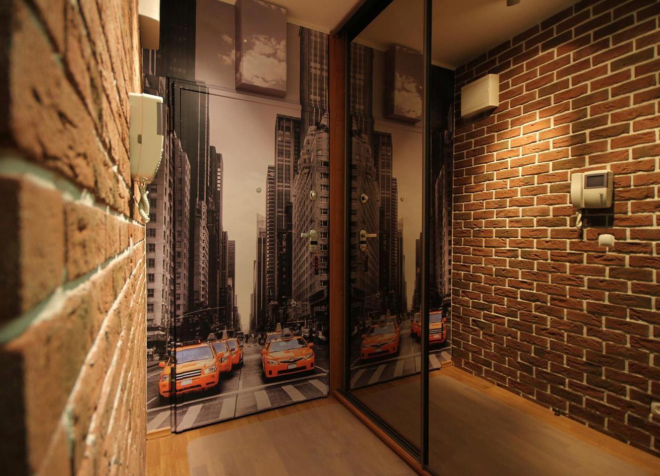 На фото кирпичная отделка стен серого цвета в коридоре.