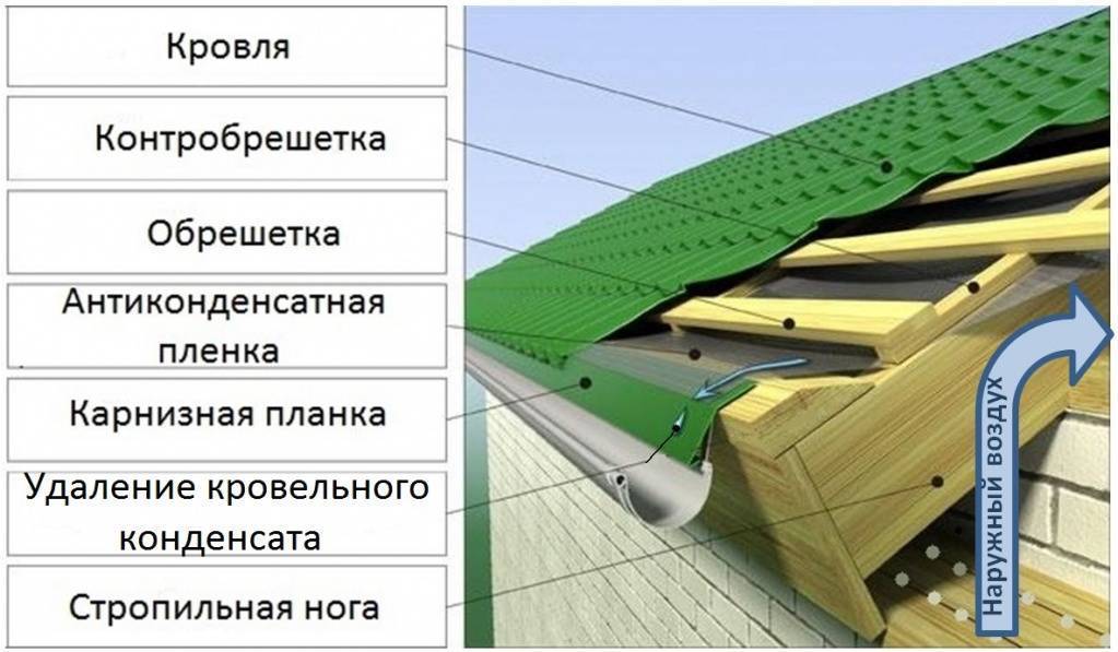 Пространство для вентиляции создается путем установки обрешетки, толщина которой должна быть не менее 40-50 мм. Воздух для вентилирования забирается через софиты или другие элементы на карнизе кровли, а его естественный выход происходит через конёк крыши.