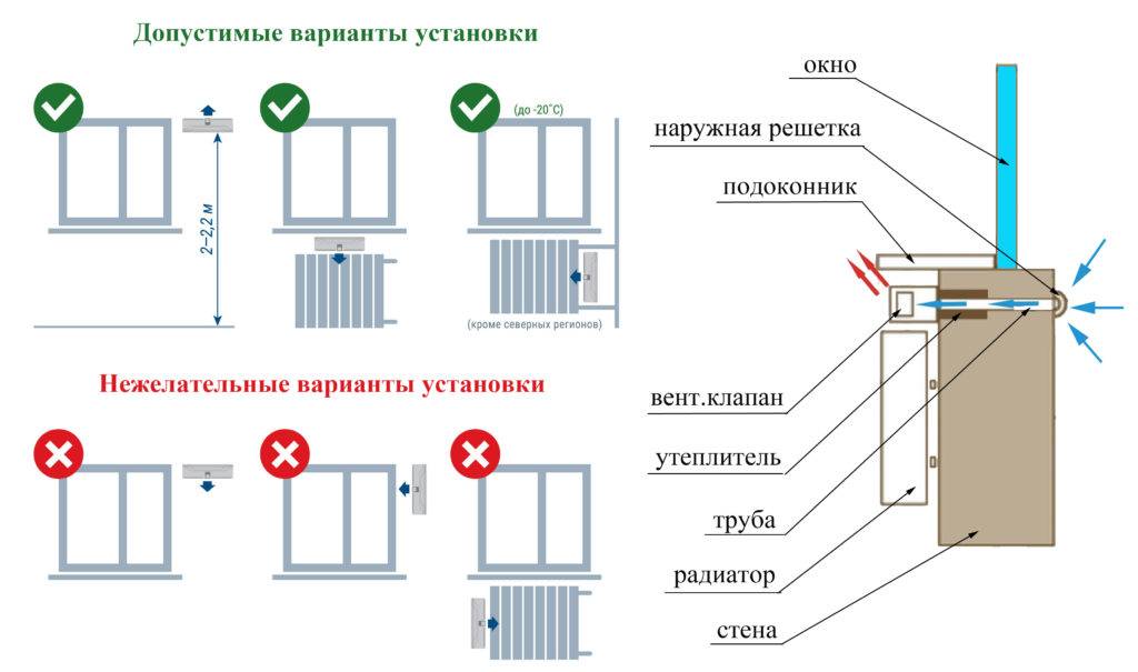 Естественный приток монтируют на уровне 2 м от пола или над батареями.