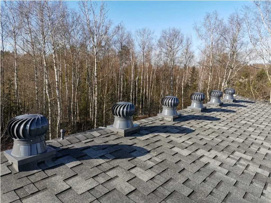 Еще одним элементом вентиляции крыши в частном доме являются кровельные вентиляторы, которые монтируются поблизости от конька, на определенных участках с рекомендуемым расстоянием между ними в 10-12 м. Подобные принудительные вентиляторы применяются при невозможности организовать естественную вентиляцию, а также при постройке плоских крыш, естественной конвекции которых недостаточно для нормальной терморегуляции.