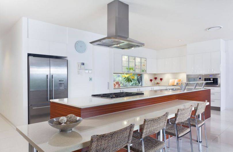 Островные изделия могут быть размещены в любой точке помещения, так как они монтируются к потолку. Такие конструкции часто используются в дизайнерских вариантах кухонной мебели.