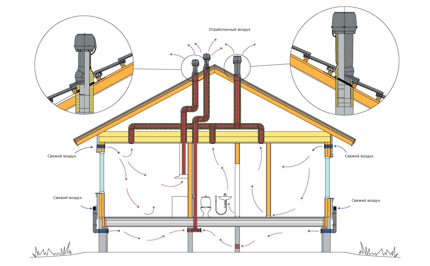 Одно из оптимальных мест для размещения вентилятора — на крыше. Такое решение имеет несколько преимуществ: