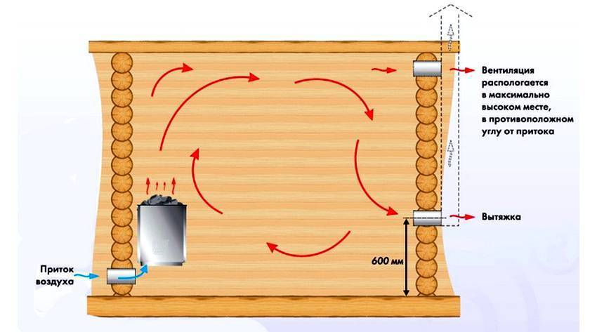 Свежий воздух должен беспрепятственно заходить в помещение, а отработанный выходить обратно.Существует несколько способов движения воздуха в банном помещении: