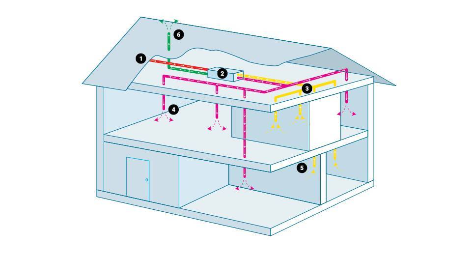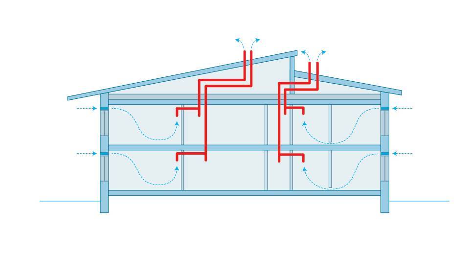 Имеется в виду, что отработанный воздух выводится через вентиляционные шахты и каналы наружу (на крышу), а свежий поступает через окна, двери или специальные приточные клапаны.