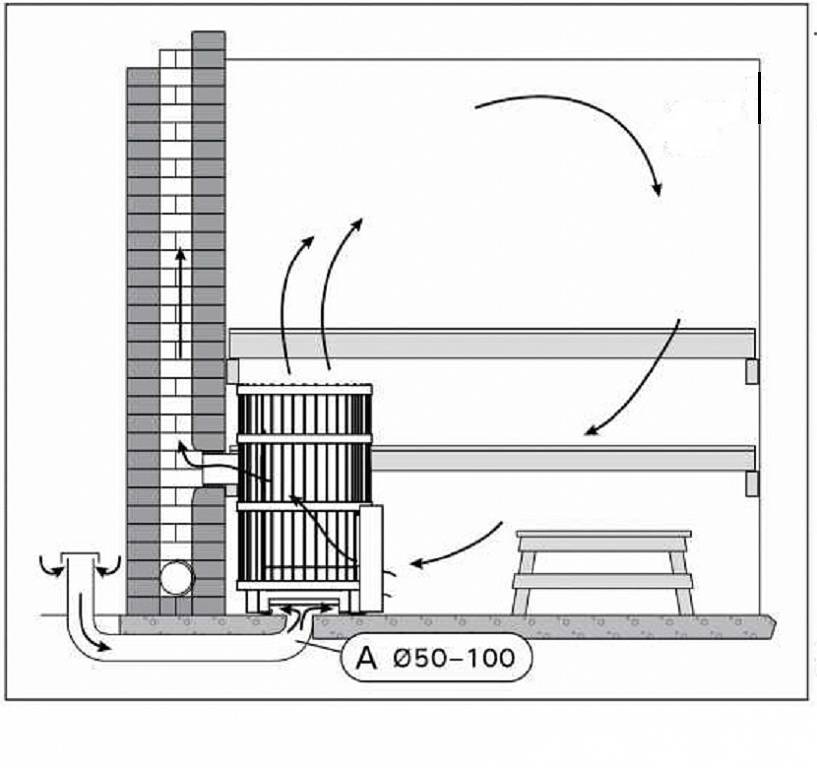 Этот способ как сделать вентиляцию в парной не самый надежный и эффективный, так как большая часть свежего воздуха сразу втягивается в печь. Поэтому ещё во время строительства бани желательно продумать другие варианты с устройством продухов в стенах.
