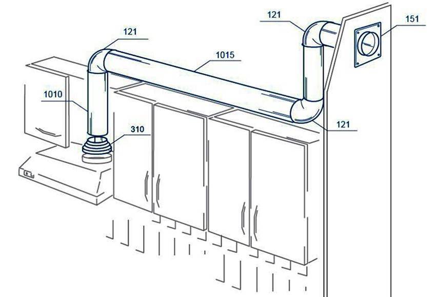 - Подготовка схемы монтажа патрубка. Учитывая особенности кухни, гарнитура и расположения вентиляционной шахты разработать воздуховода. Это поможет определить точное количество необходимых труб, решеток, крепежей, фитингов и хомутов.