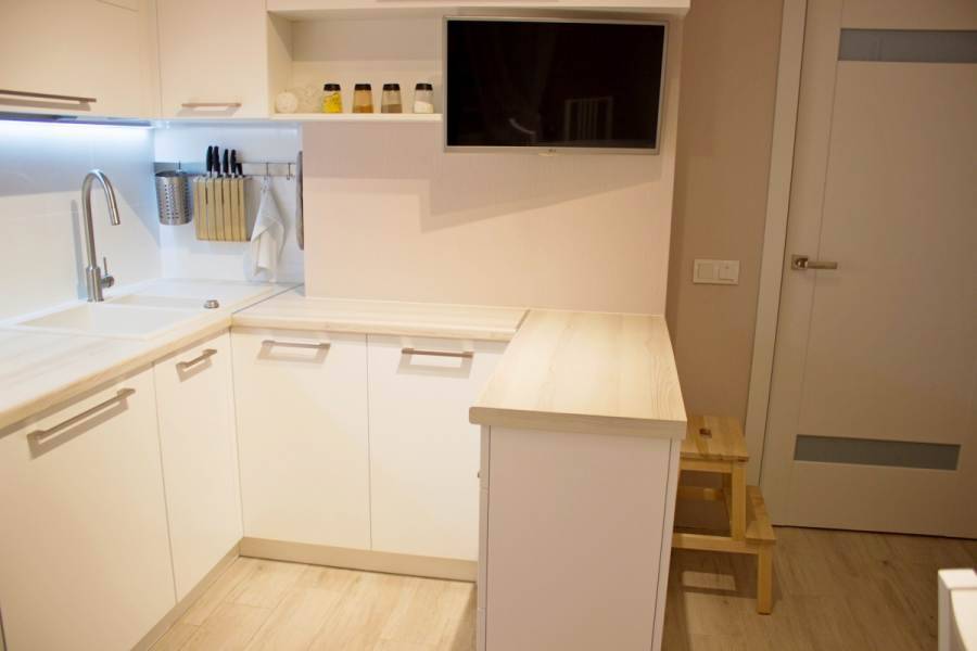 Установив плазму на вентиляционном коробе, вы добьетесь двух целей: спрячете короб и выделите место для важного в современной кухне предмета. Вентиляционный канал будет менее заметен, если вы примените те же отделочные материалы, что и на соседних стенах, например, обои