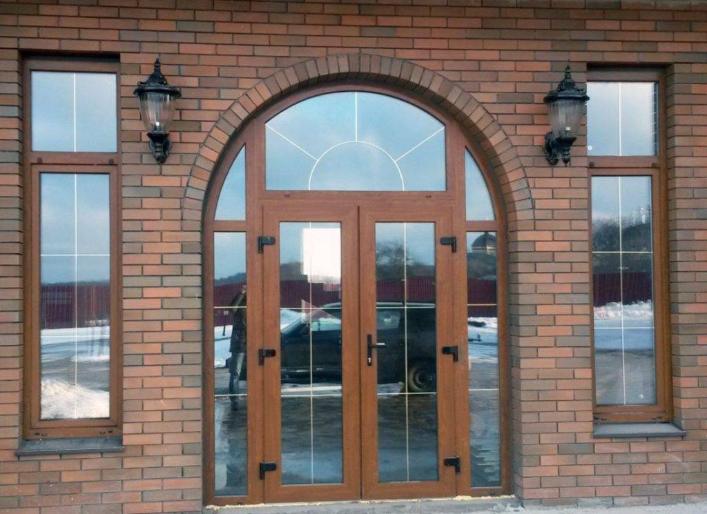 - Форма. Обычно дверной проем бывает прямоугольной или квадратной формы, но вход в дом может быть и арочным. Арку при этом делают в виде отдельного декоративного стеклянного элемента либо верхнюю часть створок двери делают закругленной.