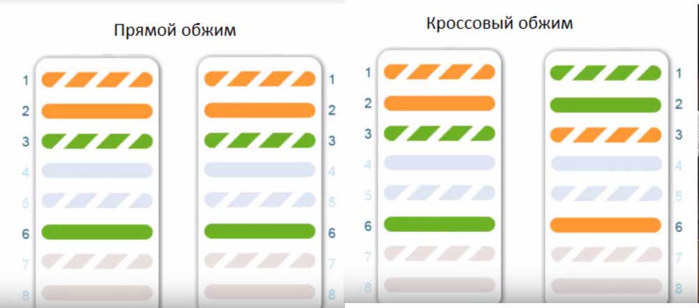 Так как подключение будет осуществляться напрямую к компьютеру обжим лучше провести по схеме «Кросс».