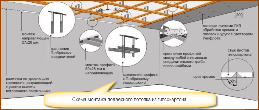 Именно потолочные подвесы обеспечивают необходимый уровень и прочность профильного каркаса