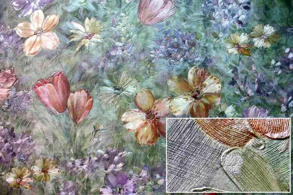 Далее пластику придают заданный рисунок трафаретным способом. Полотно получается пористым, объёмным, отличается разнообразием цветов и текстур. Однако, верхний слой за счёт рыхлости неустойчив к механическим повреждениям и требует бережного ухода. Этот недостаток компенсируется удобством и лёгкостью при поклейке.