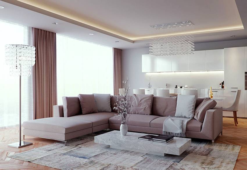 Для просторной гостиной подойдут наиболее изящные варианты с большим количеством украшений. Полотно стоит укладывать в виде складок и прочих узоров.