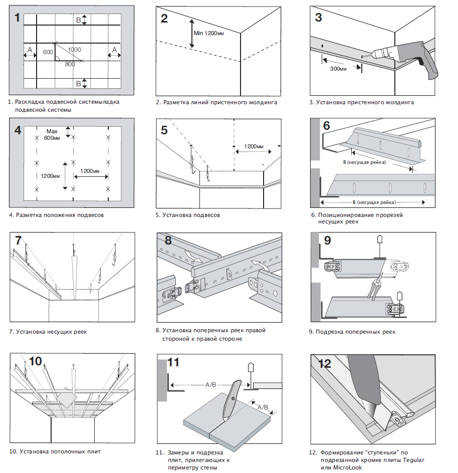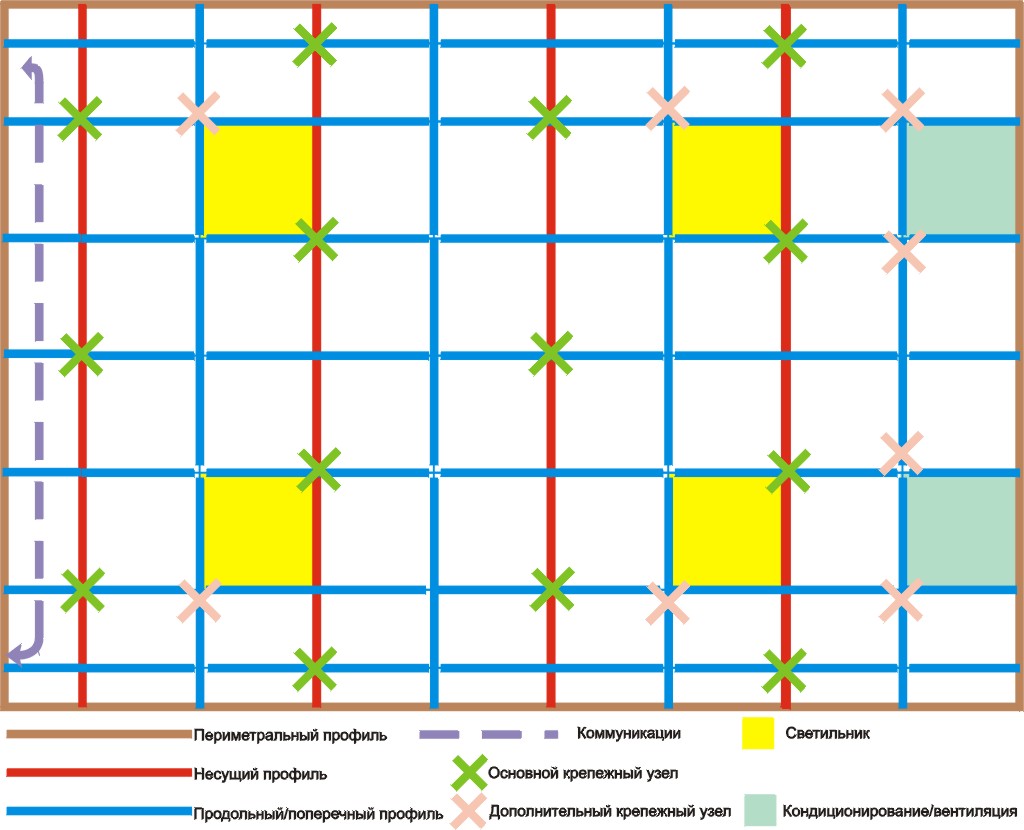 Схема монтажа кассетного витражного потолка типа Армстронг