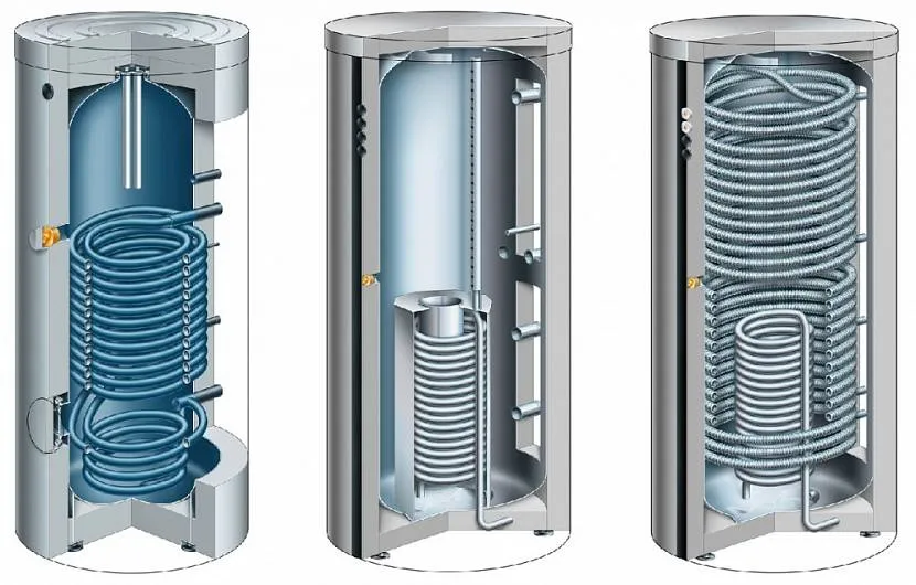 Бойлеры косвенного нагрева отличаются от всех других источников теплой воды тем, что данная система не имеет своего нагревательного компонента. Нагревание воды, в такого рода концепции, исполняется за счет влияния наружных отопительных приборов. Это может быть котел, центральное отопление либо солнечные батареи. Водонагреватель косвенного нагрева, как правило, ставится рядом с отопительным котлом, и данный «дуэт» захватывает довольно значительную область, особенно в случае если оба устройства напольного вида. Конструкция водонагревателя косвенного нагрева позволяет подсоединить ТЭН.