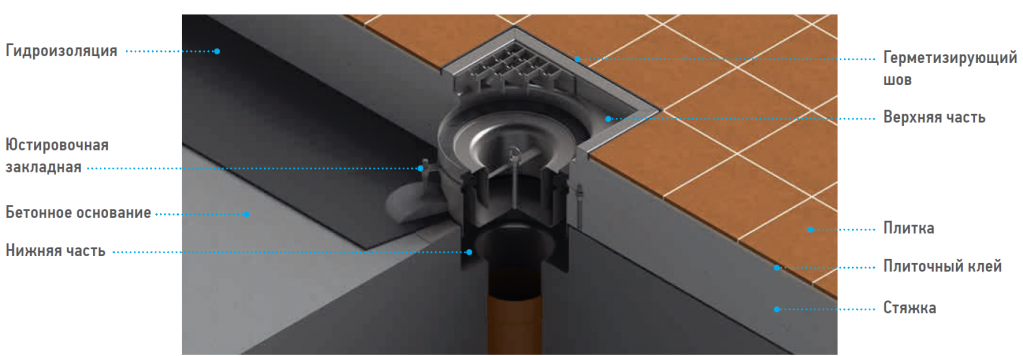 Рассортировать лотки – разложить секции по линиям согласно чертежам или монтажным схемам вдоль оси установки лотка. Установить выпуск в раструб канализационной трубы. При использовании двухкорпусных систем сначала устанавливается нижняя часть приемного устройства, в которую заводится гидроизоляция, а затем проводится монтаж в нижеследующем порядке.