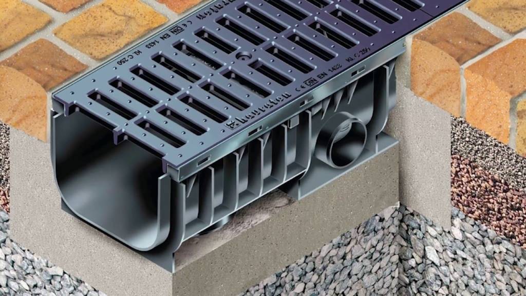 Укладка водоотводных лотков должна выполняться правильно, и одним из обязательных условий является соблюдение уклона системы – не менее 10 мм на один метр длины.