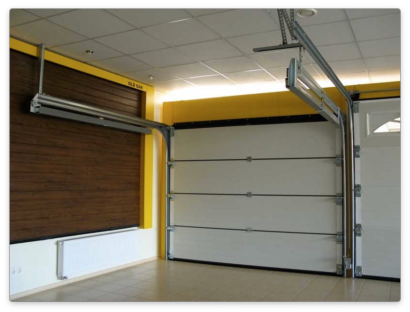 Секционные ворота представляют собой серьезную конструкцию, совокупность механизмов, секций, полотна, которые передвигаются внутри помещения, по специальным направляющим. Последние особым образом закреплены под потолком.