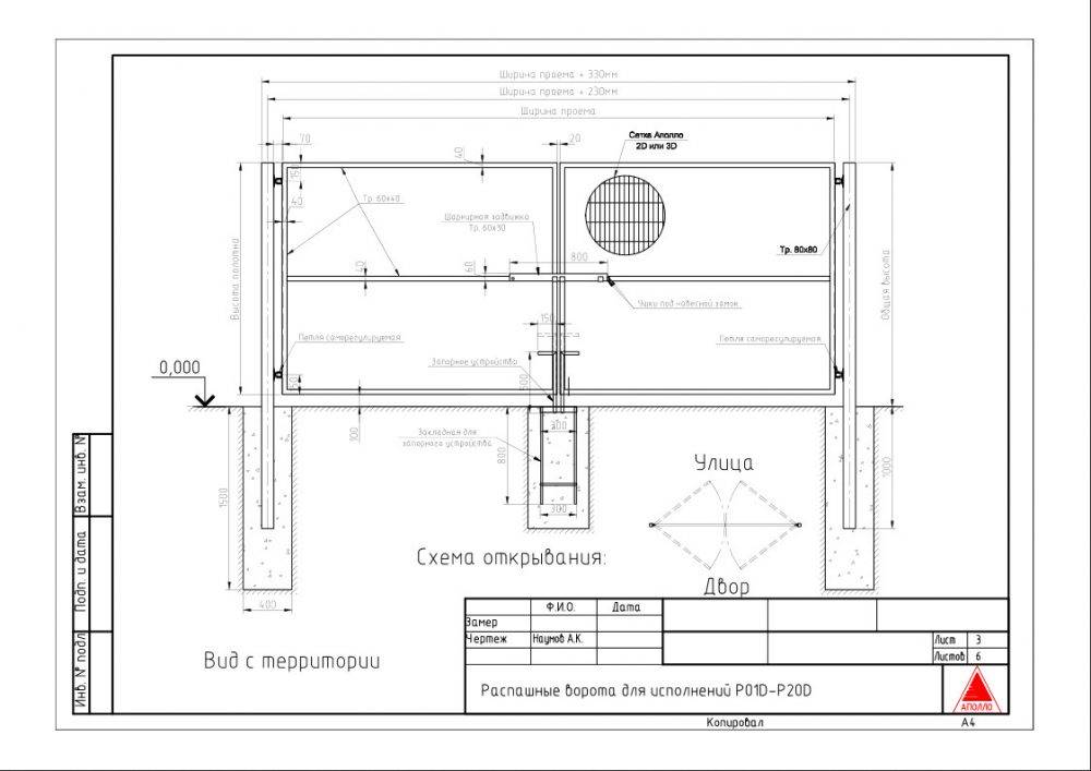 Схема распашных ворот из профнастилаСхема распашных ворот из профнастила с размерами
