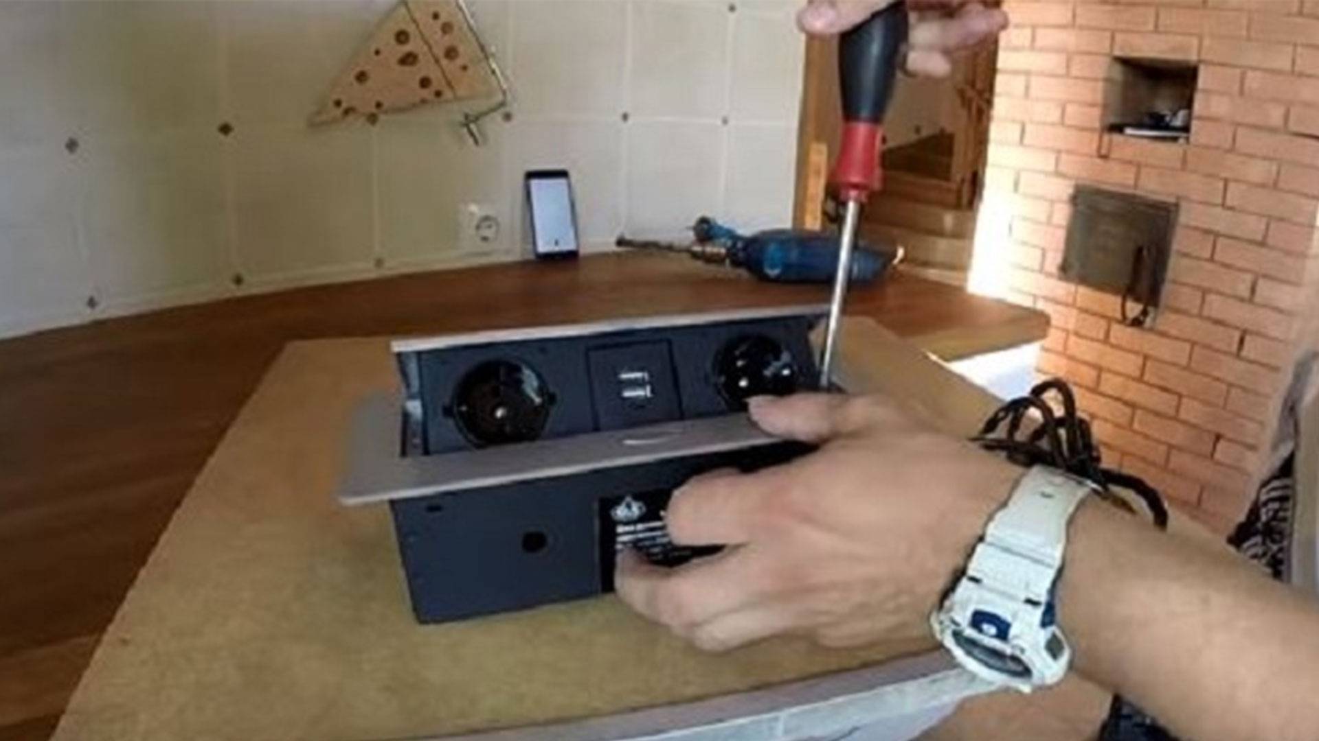 - Вставить розетки в подрозетник и прикрутить их винтиками. При этом можно добавить силикон по периметру на столешницу для увеличения герметизации сетевого блока. Это обеспечит дополнительную защиту устройства на тот случай, если разольется вода.