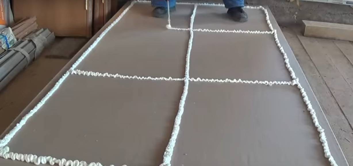 Обрезанный по длине лист укладывают на пол, напротив стены. Пену наносят по периметру листа, а затем внутри этого прямоугольника «рисуют» одну вертикальную и 3 горизонтальных полосы. В итоге, на ГКЛ должно быть «нарисовано» 6 одинаковых квадратов монтажной пеной.