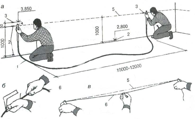 Отбивку выполняют так: берут разметочный шнур, всыпают в коробку синьку, тщательно встряхивают и натягивают шнур между метками. Затем оттянув его пальцами, резко отпускают. На стене образуется ровная линия синего цвета, которая и является новым уровнем пола.