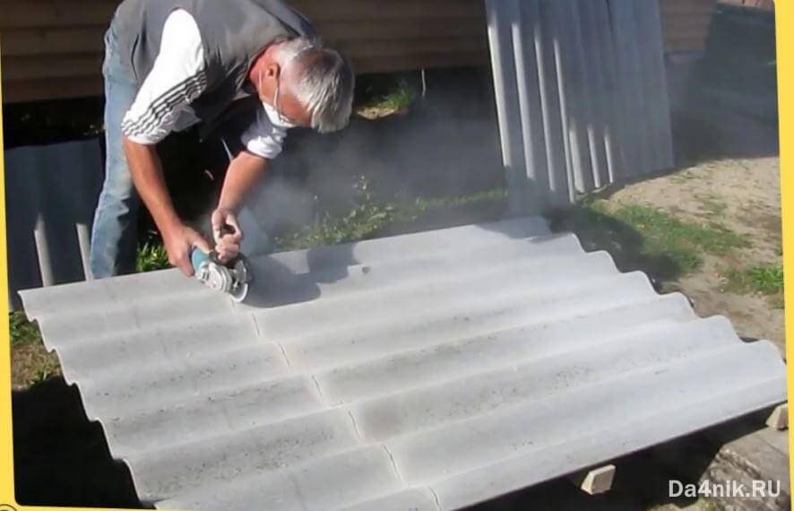 Работать лучше с помощником: один человек придерживает лист, а другой разрезает материал. Также место реза надо поливать прохладной водой. Это необходимо для предупреждения перегрева диска и распыления образующейся асбестовой пыли.