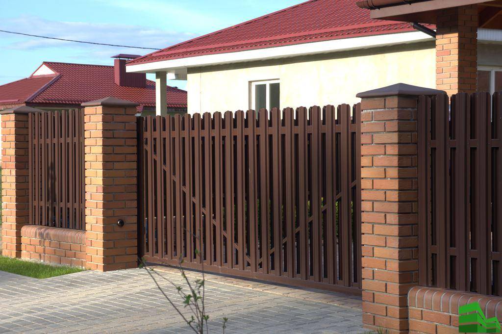 Забор из металлического штакетника с кирпичными столбами