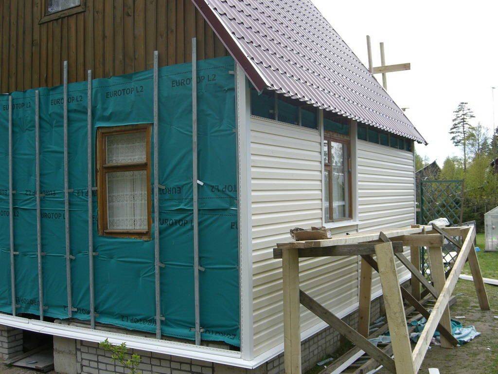 - Порядок действий, в этом случае, такой. Сначала выполняется гидроизоляция стен: пропитка или рулонная мембрана — это зависит от конструктивного материала стен. Для блоков и кирпича больше подходит пропитка, для дерева – плёнка. Далее устанавливается ППН; затем, с шагом 80-100 см по линии обрешётки, подвесы; потом теплоизоляционные плиты (если это утепляемый вентфасад); и в последнюю очередь, стойки.