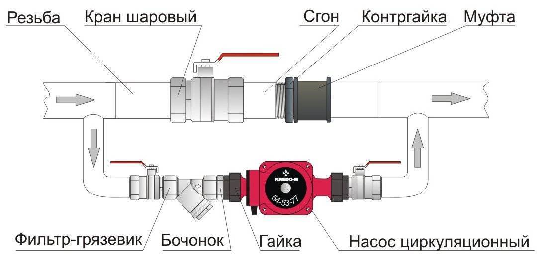 байпас монтируют на обратном трубопроводе, что позволяет избежать перегрева циркуляционного насоса