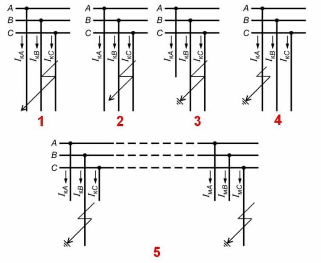 Доля однофазных КЗ составляет 65% повреждений, 2 фазы с землей — 20%, двухфазных — 10%, трехфазных — 5%. Часто случаются сложные виды повреждений, сопровождающиеся многократной несимметрией. Это означает тип замыкания различных фаз, происходящего в нескольких точках единовременно.