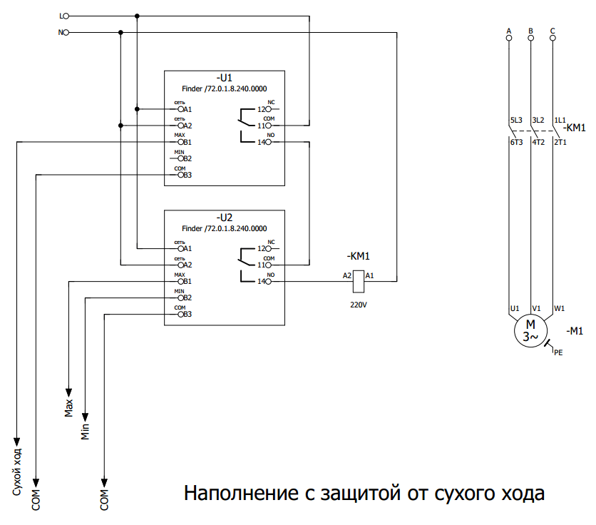 Принцип работы при использовании для защиты от сухого хода прост: пока есть вода, датчик-поплавок задран вверх, насос может работать, как только уровень воды упал настолько, что датчик опустился, контактор размыкает цепь питания насоса, он не может включиться до тех пор, пока уровень воды не поднимется. Для защиты насоса от холостого хода кабель поплавка подключается в разрыв фазного провода.