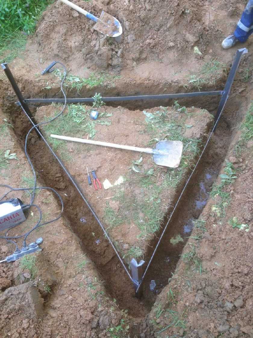 Для этого необходимо с помощью штыковой лопаты по периметру размеченного треугольника со сторонами по 3 м снять слой земли в 30–50 см. Это необходимо для того, чтоб в дальнейшем без особых трудностей к заземлителям приварить полосовой металл.