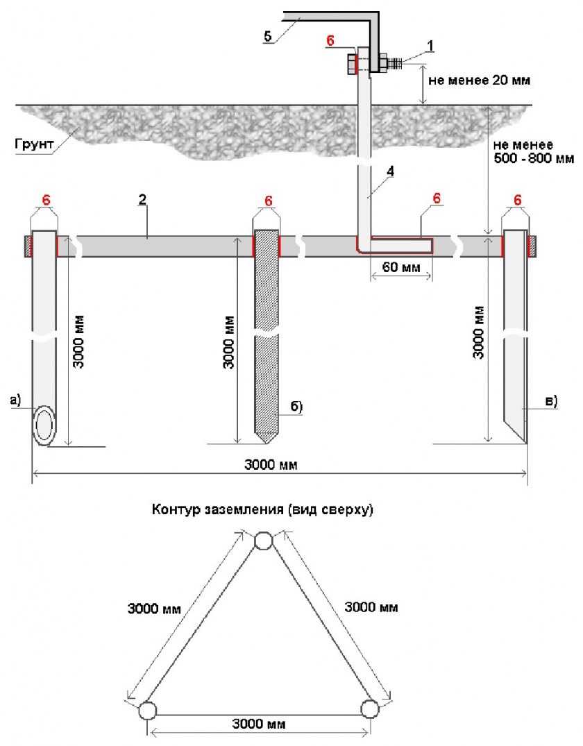Чтобы упростить вбивание штырей, можно создать три вертикальных отверстия при помощи бура, и лишь после этого вбивать заземлители в землю.Не забывайте, что вся конструкция должна быть заглублена в грунт на 0,5 метра, соответственно все параметры нужно рассчитывать начиная с этой глубины, а не поверхности земли.