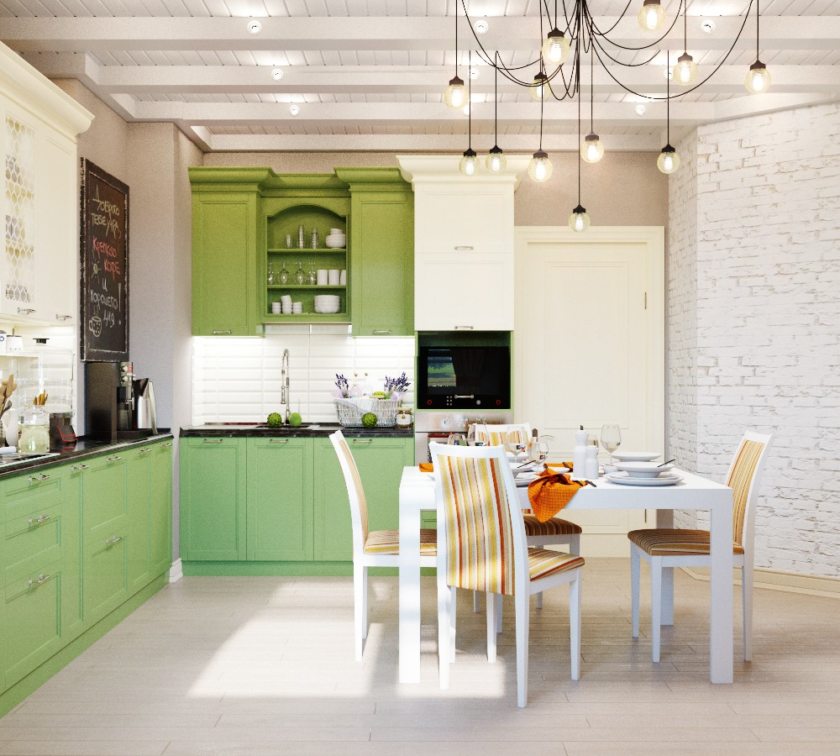 Варианты сочетаний оттенков зеленого в кухне следующие: