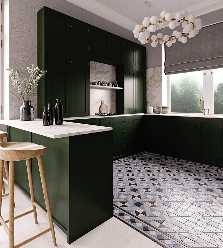 Изумрудный и малахитовый оттенки – идеально подходят для оформления классической кухни в зеленом цвете, поскольку максимально раскрывают глубину цвета и подчеркивают его изысканность, роскошь.