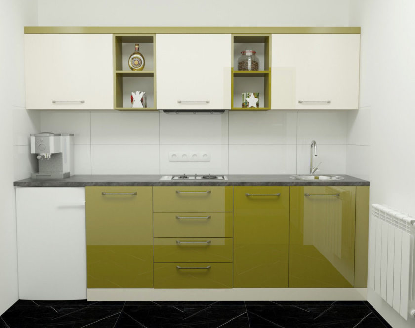 - Сочетая желтый тон с зеленым, разбавляя и комбинируя между собой, добиваясь редких колоритных вариантов. Ламинированный фасад шкафов и покрытие столешницы, взаимосвязаны с оттенком рабочего фартука. Добавление ярких красок на внешнем контуре ящиков, только внесет изюминку в дизайн проект.
