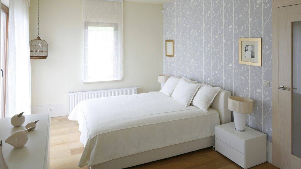 Еще одна классика, которую можно считать очень универсальной — это белые обои. Геометрические узоры фокусируют свет, попадающий в комнату, и делают комнату более уютной. Белые обои также могут представлять собой набивший популярность в последнее время узор из досок. Используя этот рисунок, вы создадите атмосферу лета, праздника и положительное, теплое впечатление.