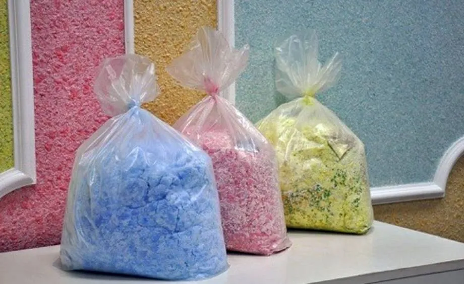 Заводские жидкие обои упаковываются в герметичные пакеты. Сухая масса по инструкции растворяется в воде, после настаивания раствор готов к нанесению. Интересно то, что покрытие ремонтопригодно. Поврежденный участок можно размочить, устранить, ту же «штукатурку» нанести заново. Правда, это возможно, если отделка не была дополнительно пропитана краской или лаком.