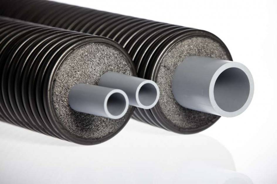 Этот способ утепления считается одним из самых дорогостоящих. Производитель предлагает мастеру уже готовые тубы, оснащенные теплоизоляционным материалом. Конструктивно — это одна основная пластиковая/полиэтиленовая труба, обернутая утеплителем и помещенная в другую (большую по диаметру). Остается лишь правильно уложить их в траншею.