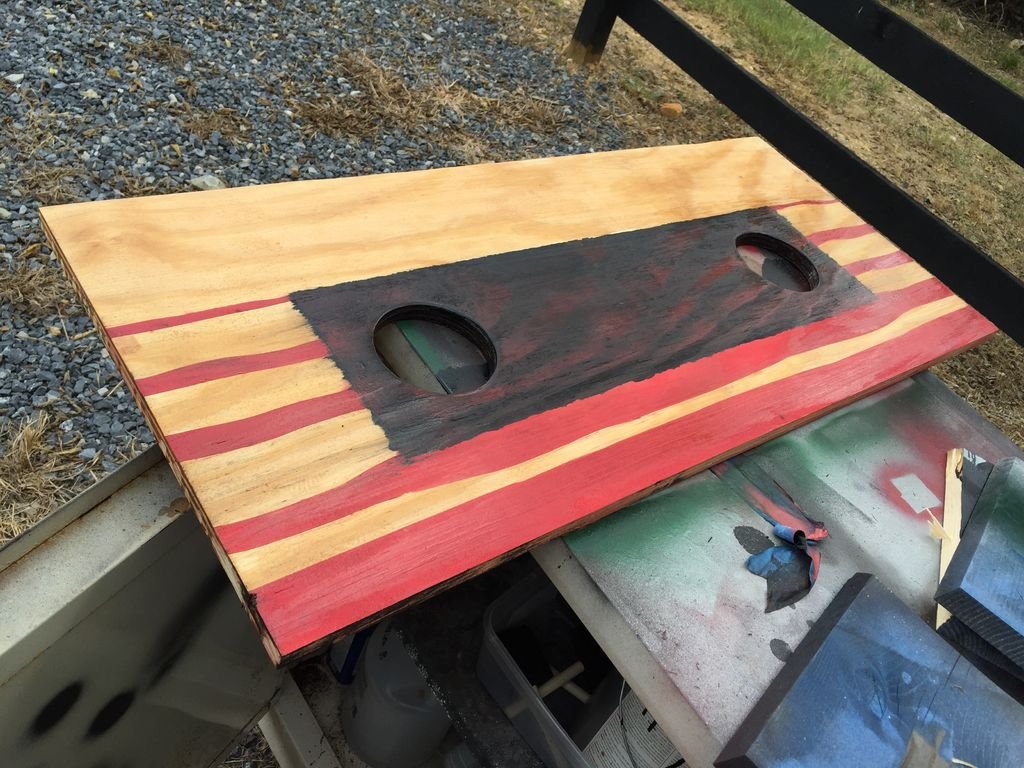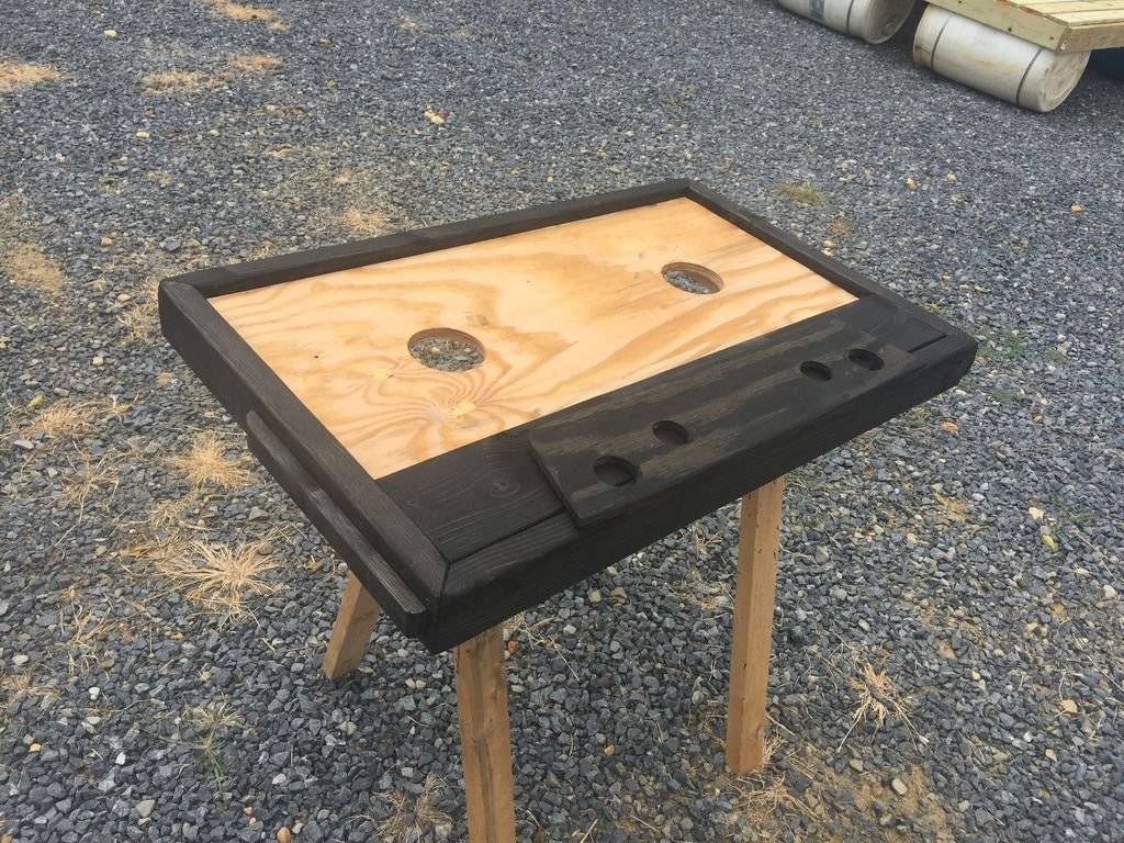 Шаг 8. Теперь вам нужно окрасить всю верхнюю часть столика. В качестве образца можете взять саму кассету или найти подходящее изображение в интернете. В данном проекте основной каркас был окрашен черным тоном, и только фанера на самой столешнице была декорирована как этикетка на кассете. Было принято решение сделать линии не ровными. Если вы желаете поступить иначе, используйте малярный скотч. Для надписи можете заготовить трафарет или писать ее кистью от руки.