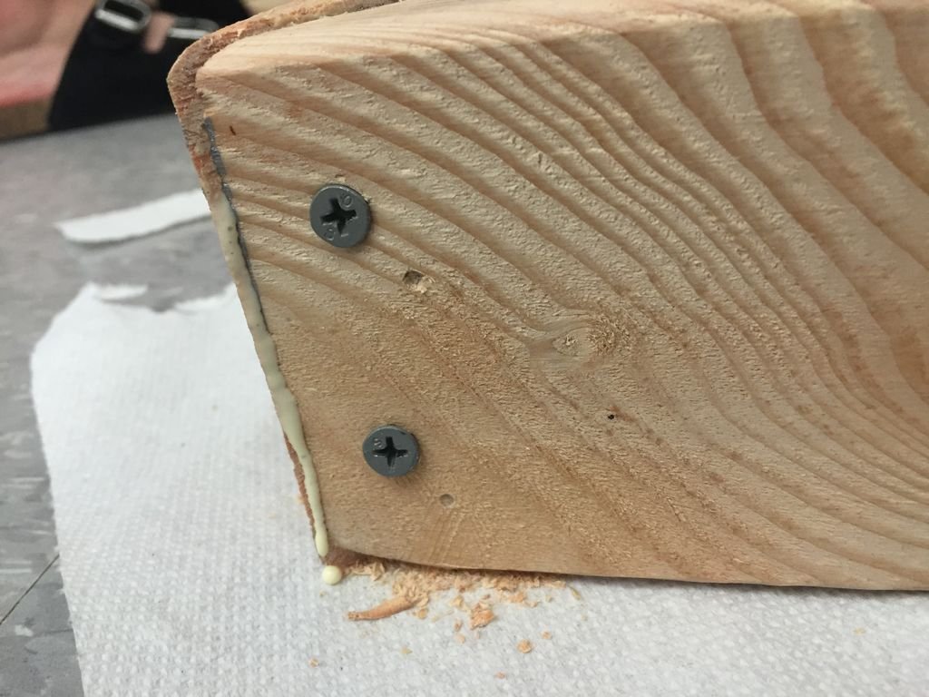 Нанесите клей для дерева по краям коротких деталей. Здесь лучше использовать пару зажимов, чтобы выровнять края перед сверлением. После выравнивания, зажима и сверления вставьте несколько заглушек с небольшим количеством клея для дерева.После того, как древесный клей высохнет, используйте древесный наполнитель, чтобы заполнить все промежутки между пробками и просверленными отверстиями. Затем отшлифуйте эти участки.