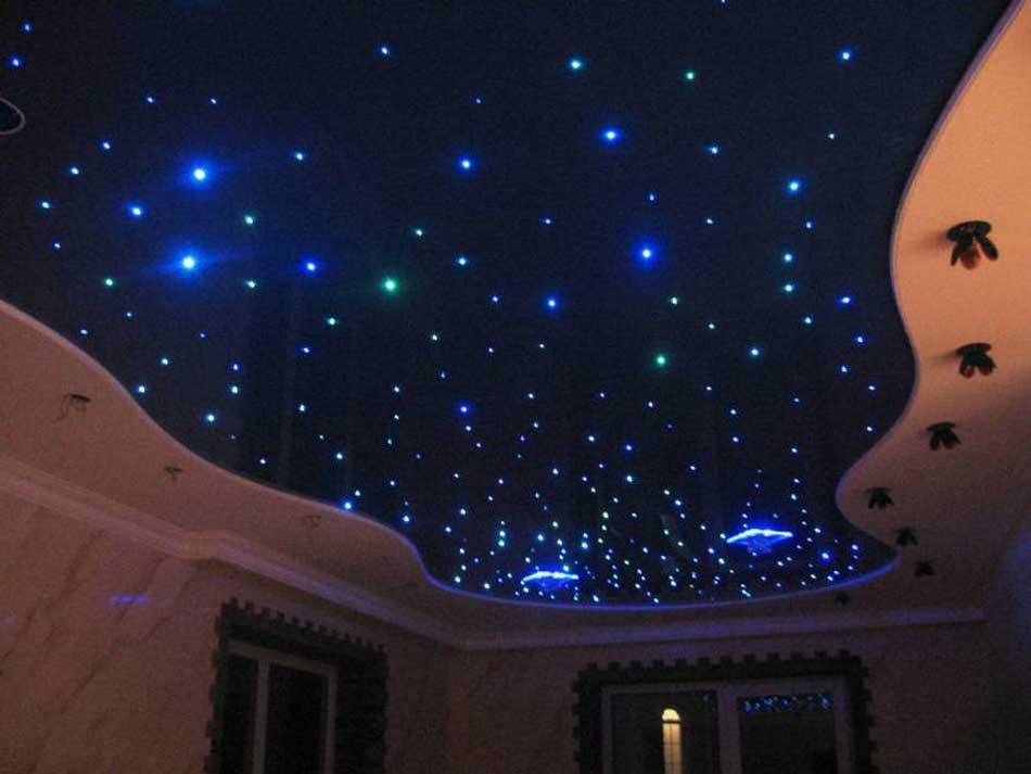 Интерес вызывает и то, что оптоволокно позволяет менять свет с затухания на увеличение светового потока. А сегодня дизайнеры в компаниях могут предложить вам и вовсе навороченные световые генераторы последнего поколения. Такие устройства позволяют потребителю не только контролировать интенсивность свечения, но и изображать на натяжном потолке летящие кометы, падающие метеоры и звезды, скопления галактик.