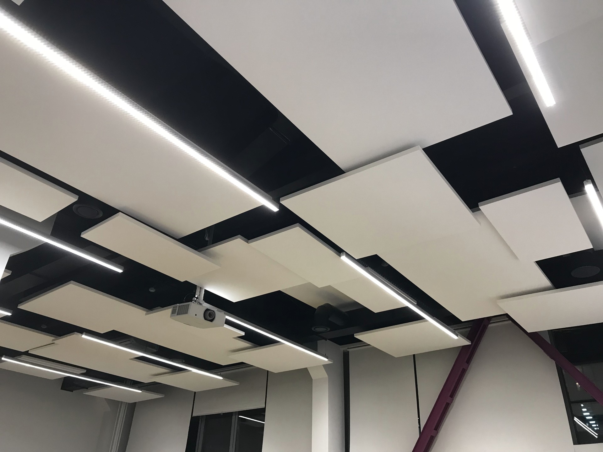 Тут на потолке висит «акустический синтепон», называется ЭкоАкустик. Можно, как здесь, повесить на грибки, а можно приклеить на клей, разницы особой нет. Собственно дальше натягивается натяжной потолок. Если так делать, то потолки лучше всего брать не самые простые пленки ПВХ, а тканевые или акустические, специальные.