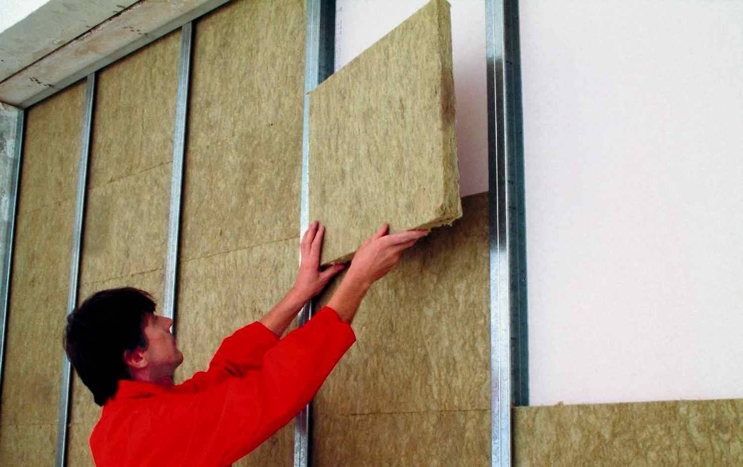 5. Каркас плотно заполняют звукоизолирующим материалом. Как самый дешевый вариант чаще всего предлагается минеральная вата. И в отличие от часто предлагаемого пенополистирола, который вопреки рекомендациям ничуть не помогает от шума, она действительно немного увеличивает звукоизоляционные свойства конструкции. Но лучше использовать акустическую минеральную вату, или другие специальные панели.