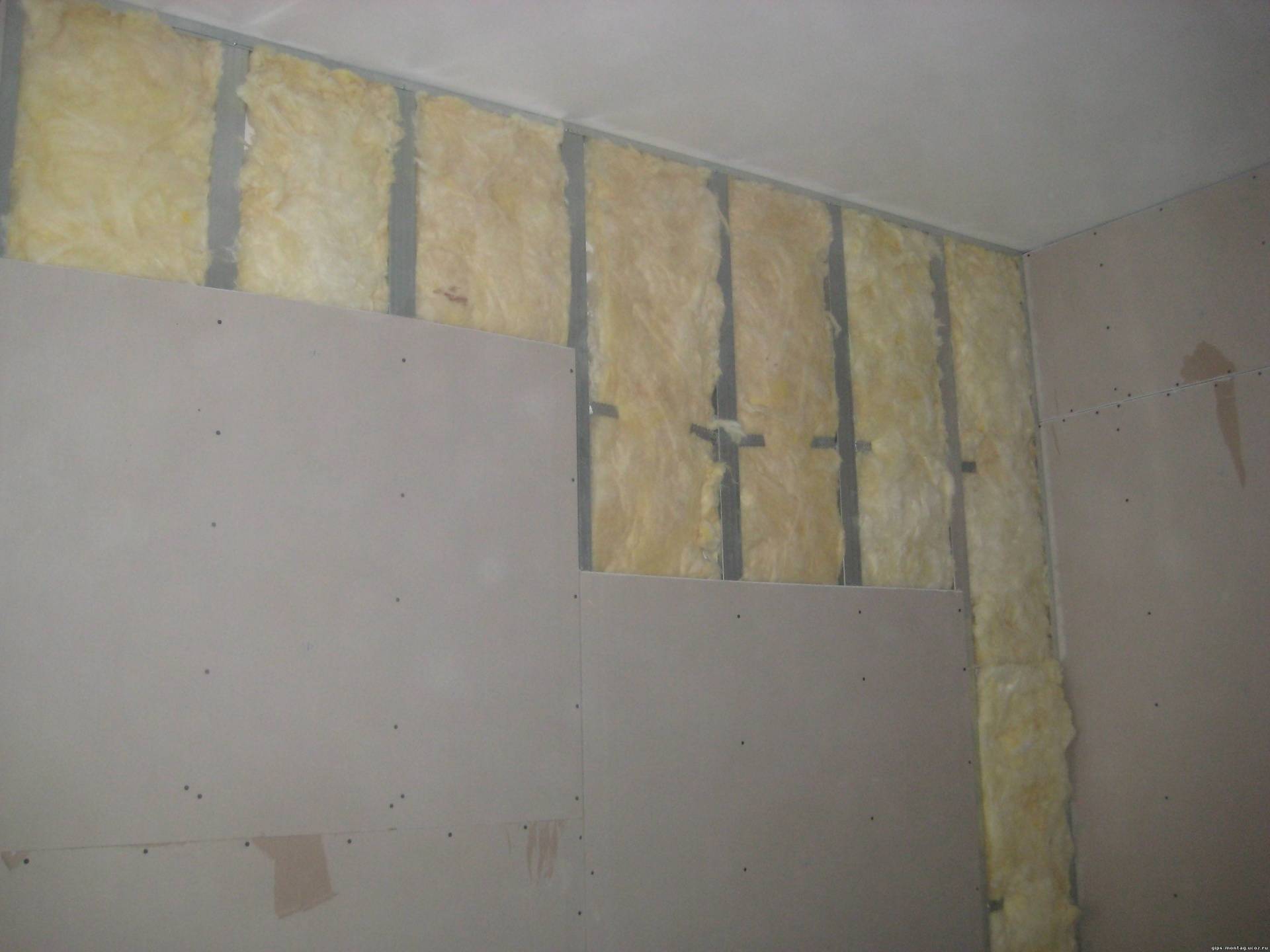 В эту конструкцию вплотную укладывается вата для обеспечения шумоизоляции. Конструкция сшивается гипсокартоном, все стыки изолируются монтажной пеной или шпаклевкой. Поверх гипсокартона накладывается декоративное покрытие – обои, декоративная штукатурка, краска.